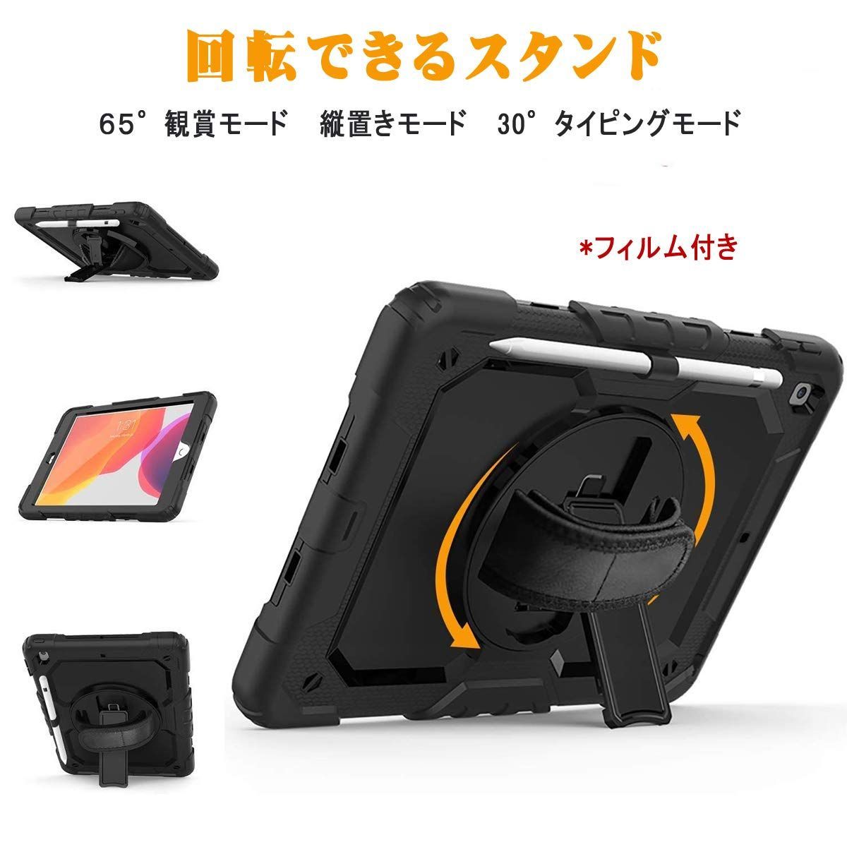 ペン収納 頑丈 ハンドストラップ付き 丈夫 肩紐 360度回転の折り畳スタンド ゴツイ 保護シール内蔵 2021 2019 2020 耐衝撃 ケース 操作簡単 第9世代 7世代 第8世代 iPad 10.2 ブラ