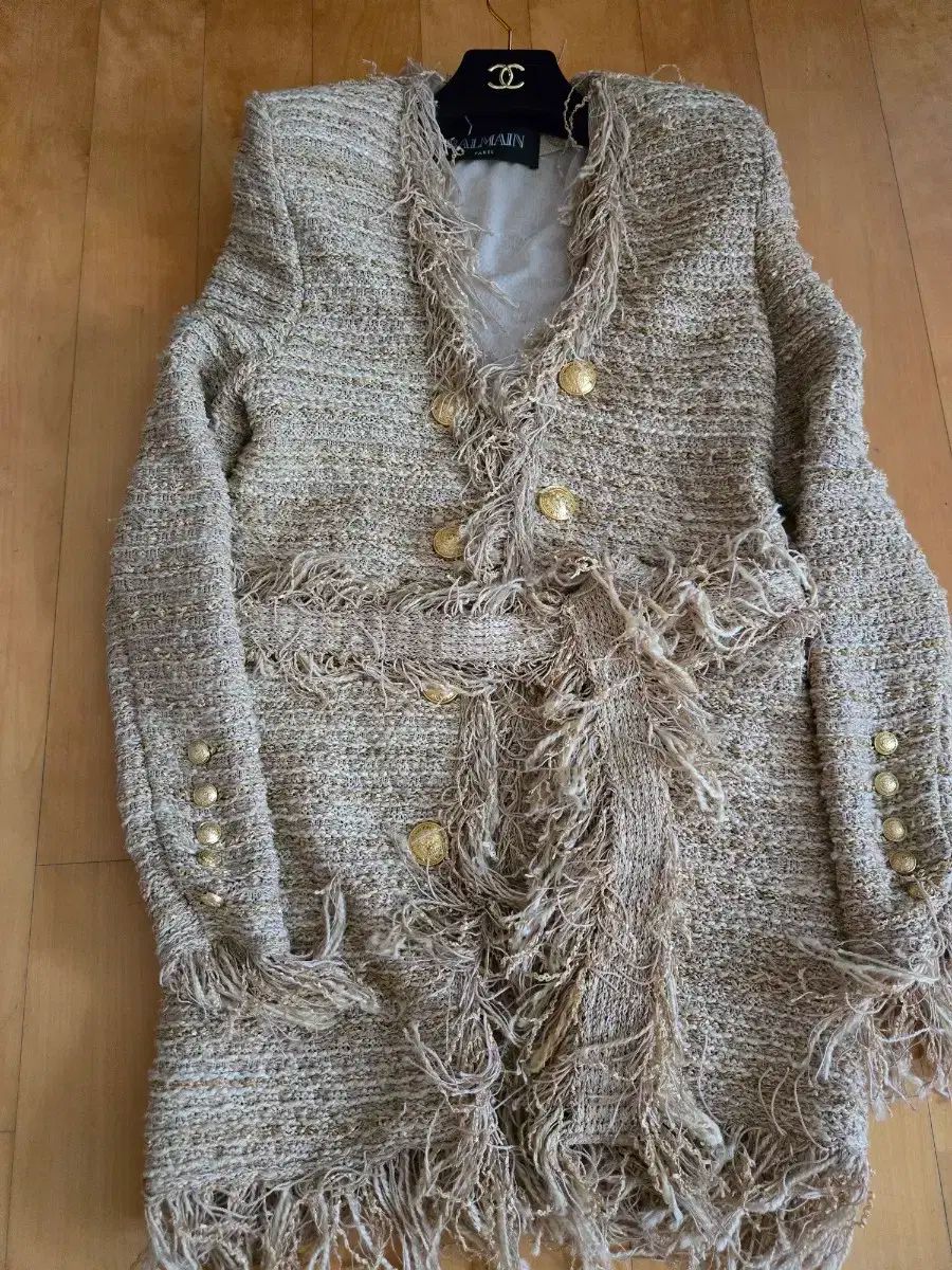 これは豪華なバルマンツイードジャケットです。ユニークなフリンジディテールとゴールドボタンが特徴です。特別な日にポイントを贈るのに最適なアイテムです。ご不明な点がなければ、すぐに安心してお支払いいただけます!