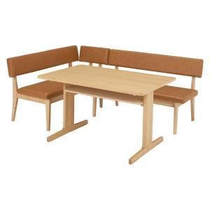お部屋を広く見せるロータイプ設計。お部屋に合わせてレイアウトの変更ができ、天然木のシルエットと高級感のあるベンチシートがリビングダイニングのくつろぎ空間を演出。主材:ラバーウッド集成材、天板:天然木化粧繊維板(オーク突板)、張地:合成皮革 組立式テーブル:(約)幅110×奥行70×高さ65cm、2Pタイプ:(約)幅115×奥行54×高さ74×座面高41cm、コーナータイプ:(約)幅123×奥行54×高さ74×座面高41cm