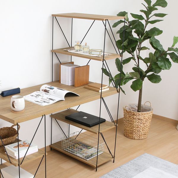 棚板の穴にワイヤーフレームを差し込むだけで完成する「ワイヤーロックシステム」を採用したシリーズで、手軽におしゃれなインテリアを楽しめます。余分な装飾をなくしたシンプルなデザインで、飽きずに長く使える多目的デスクです。幅122cmでパソコンや本などを置いてもゆったりとスペースを取って使用できます。勉強机やパソコンデスクにピッタリです。片側に4段、逆サイドに2段の収納ラックが一体になったデザインで、いつも使うものを手の届く範囲にまとめておくことができます。背面がオープンなデザインのため電化製品などのコードの配線もらくらく行うことができます。棚部分には別売のコネクトボックスがぴったり収まります。合わせて使うことで収納力もUP!
