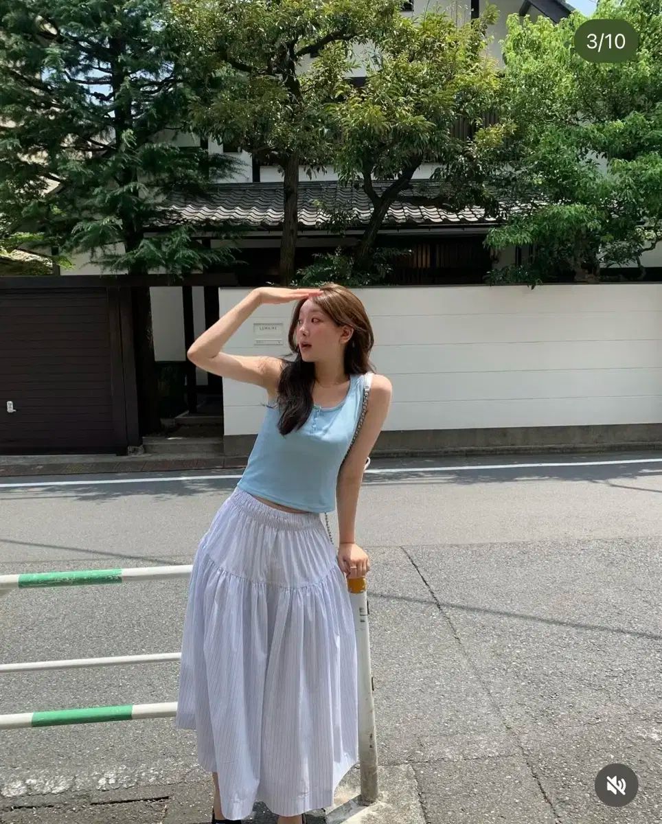 ondemin ローニー ロングスカート ストライプ ボタン スリーブレス ブルー