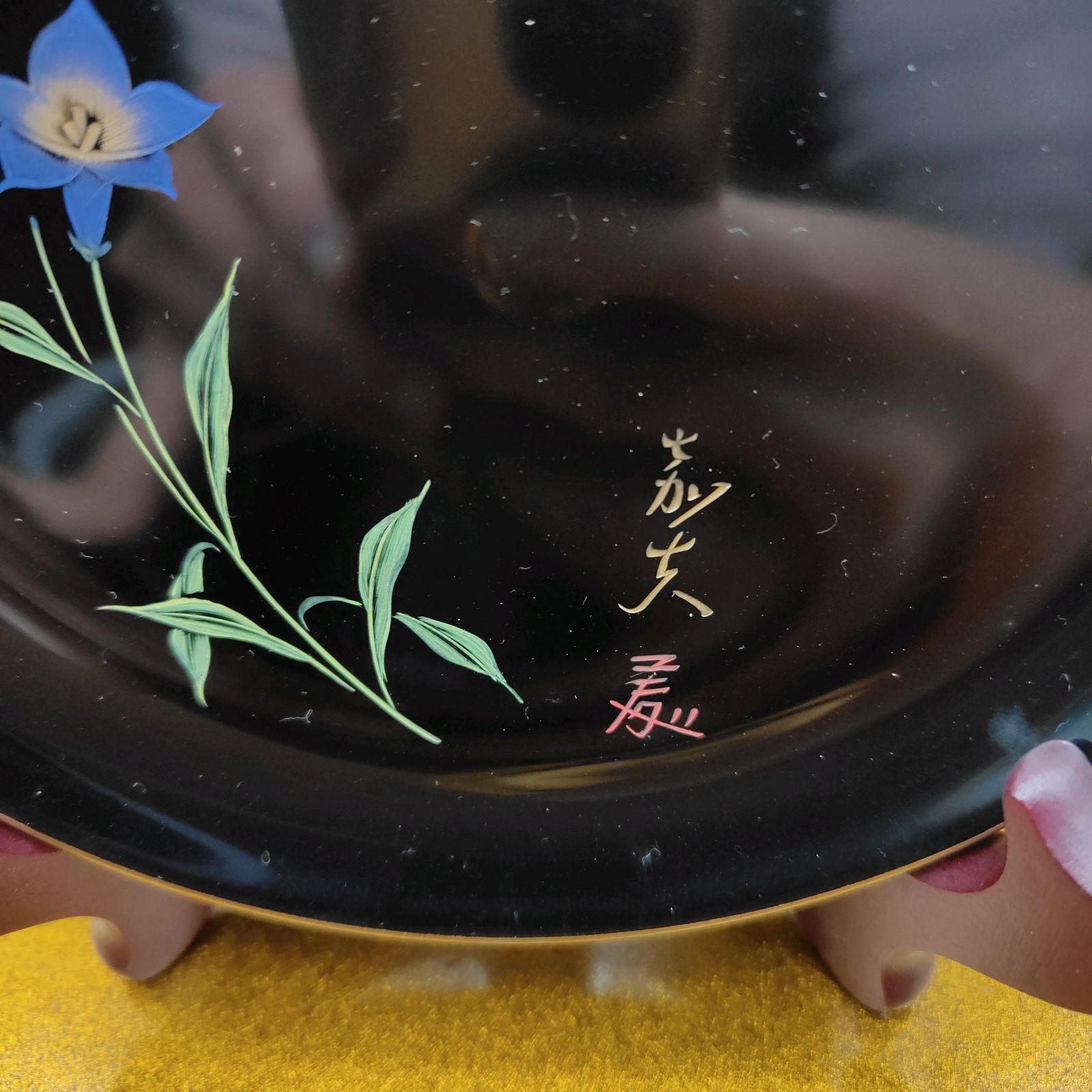 越前塗 銘々皿 沈金 漆黒 手描き 野の花 小皿 漆器 漆塗り 天然木 在銘 S 286