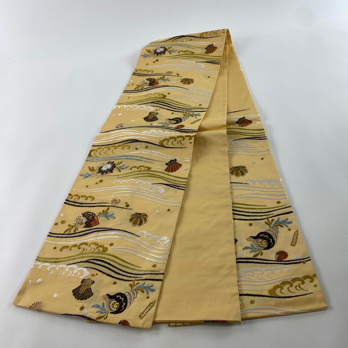 袋帯 秀品 貝 波頭 金糸 刺繍 薄オレンジ 六通 正絹