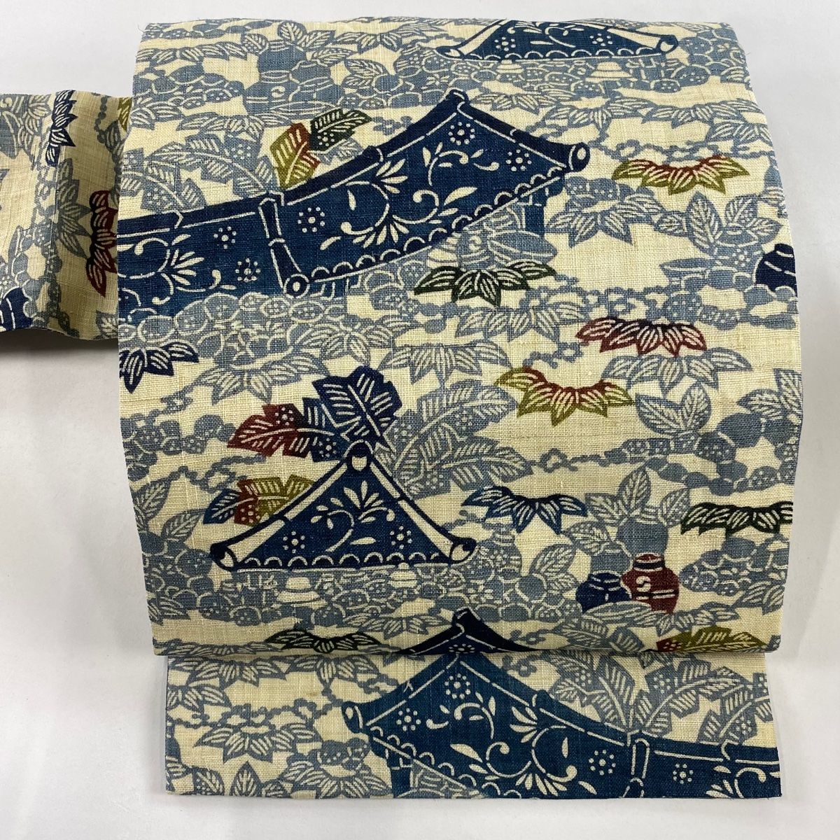 名古屋帯 名品 栗山吉三郎 落款 夏帯 紬地 瓦屋根 笹 ベージュ お太鼓柄 麻