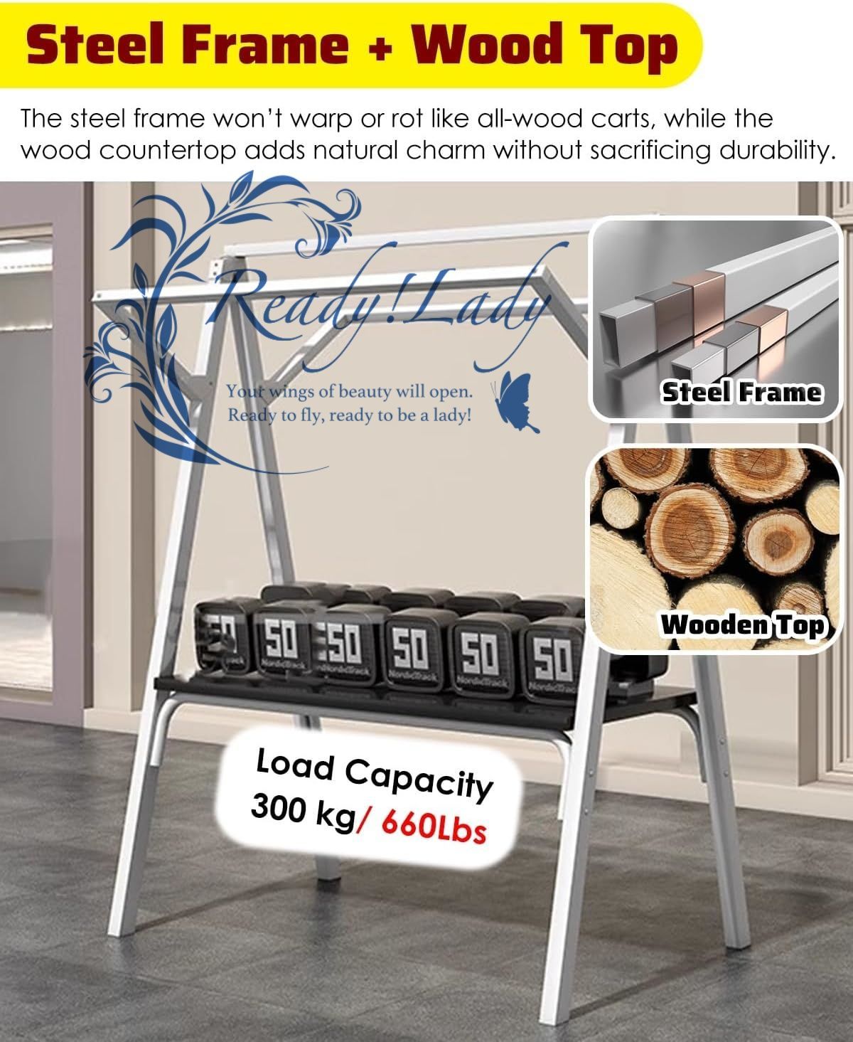 ● 素材:スチールフレーム + 無垢材カウンタートップ(耐荷重最大300kg / 660ポンド)