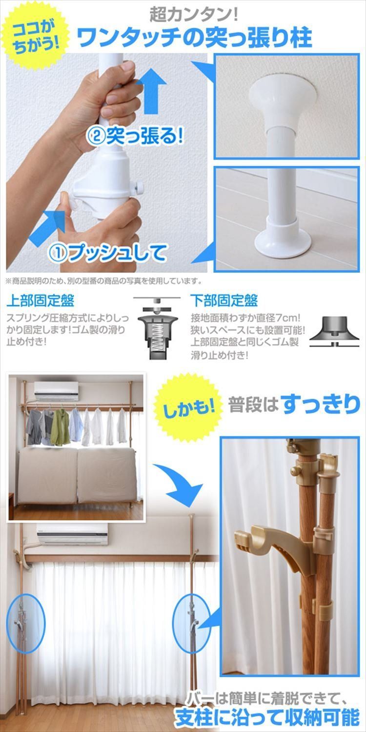 ●日当たりの良い窓際でも、エアコン下でも、壁面にも、設置場所を柔軟に決められる突っ張り固定式の室内物干し