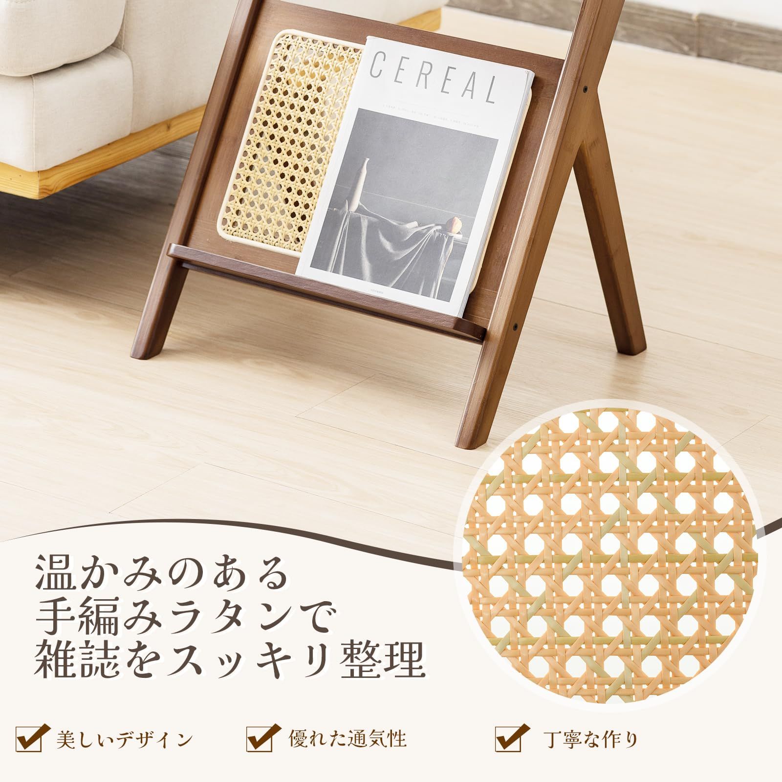 ●本体サイズ:幅50x奥行き36x高さ56cm●素材:天然竹、樹脂ラタン、グラス●天板の耐荷重:10kg●本体重量:4.2kg●カラー:ナチュラル