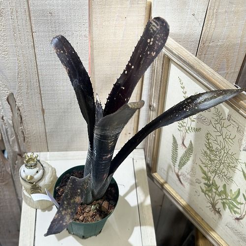 黒い葉に白いバンドや黄色い斑点が入る、まるで夜空や銀河を思わせる美しいタンクブロメリアです。