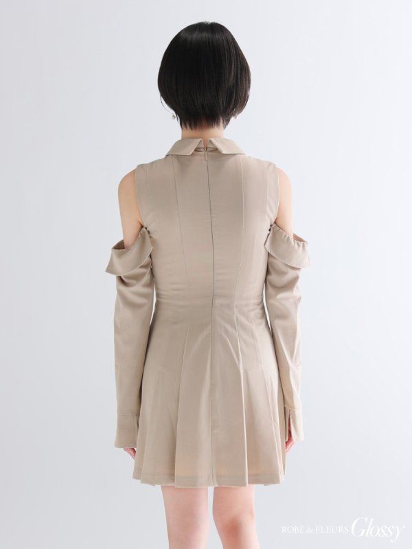 ブラウン GL 4126 ROBE de FLEURS Glossy ローブドフルールグロッシー ツイル 襟付き ジッパー 肩あき オープンショルダー 長袖 フ ミニドレス キャバドレス ワンピース