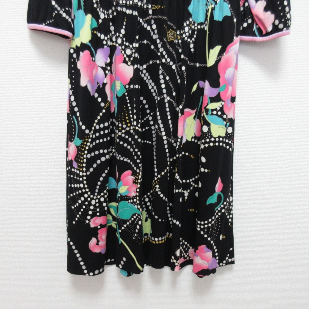 LEONARD レオナール カンカンストレッチ フラワー パールプリント スクエアネック ドレス ワンピース サイズ40 ブラック ピンク レディース 古着