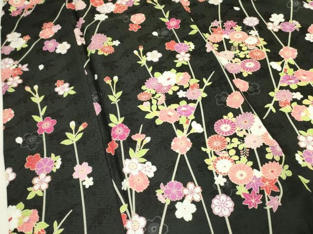 平和屋着物 小振袖 二尺袖 草花文 黒地 洗える着物 op