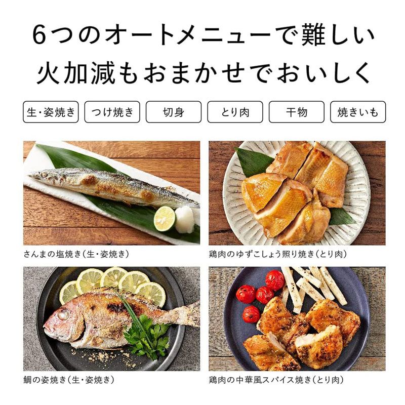 魚はもちろん、とり肉や焼きいもなどメニューに応じて火力や時間をきめ細かくコントロールし、遠赤ブラックヒーターと備長炭コートで炭火焼きのようなおいしさに。