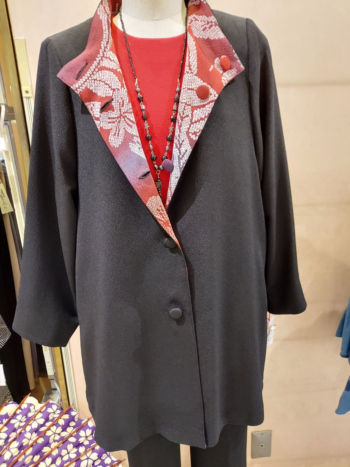ちりめんリバーシブルハーフコート[黒✖️赤色引田花柄]