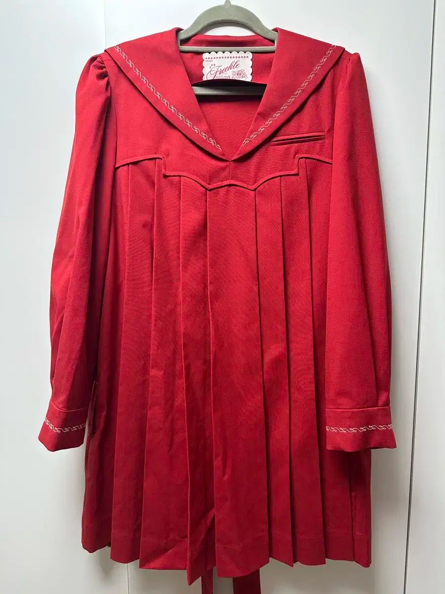 これは赤いプレッツェルのプリーツミニドレスです。セーラーカラーの刺繍のディテールが目立ちます。袖にも同じ刺繍が施され、統一感が出ています。他に質問がない場合は、すぐに安全な支払いを行ってください!