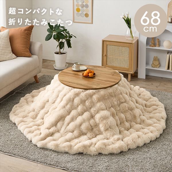 脚は折りたたんで隙間に収納も可能なコンパクト円形こたつ。ラビットファーのような、ふわもこの掛け布団セット