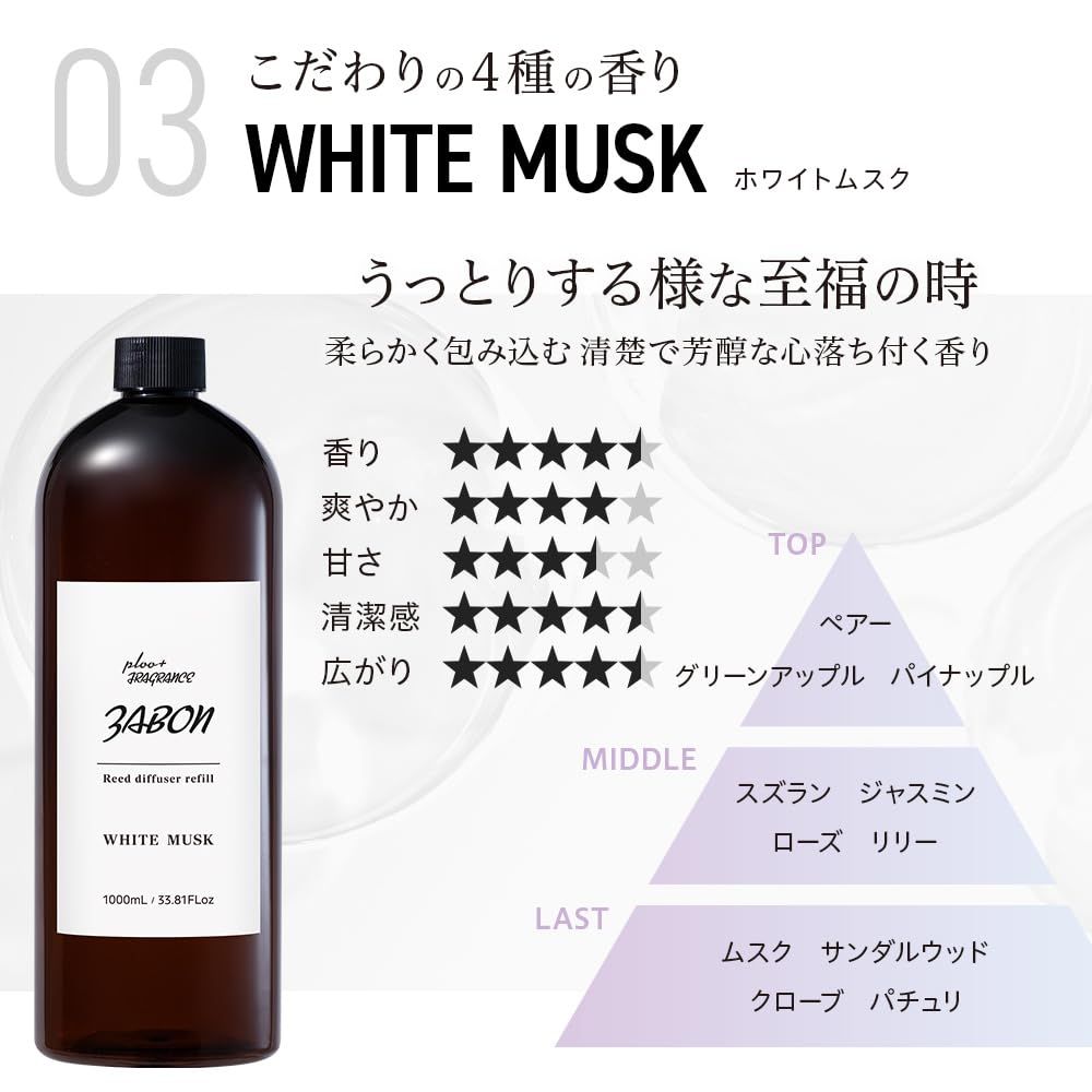 プルプラ ZABON リードディフューザー リフィル 詰め替え用 1000ml ルームフレグランス 大容量 約12ヶ月分 (ホワイトムスク)
