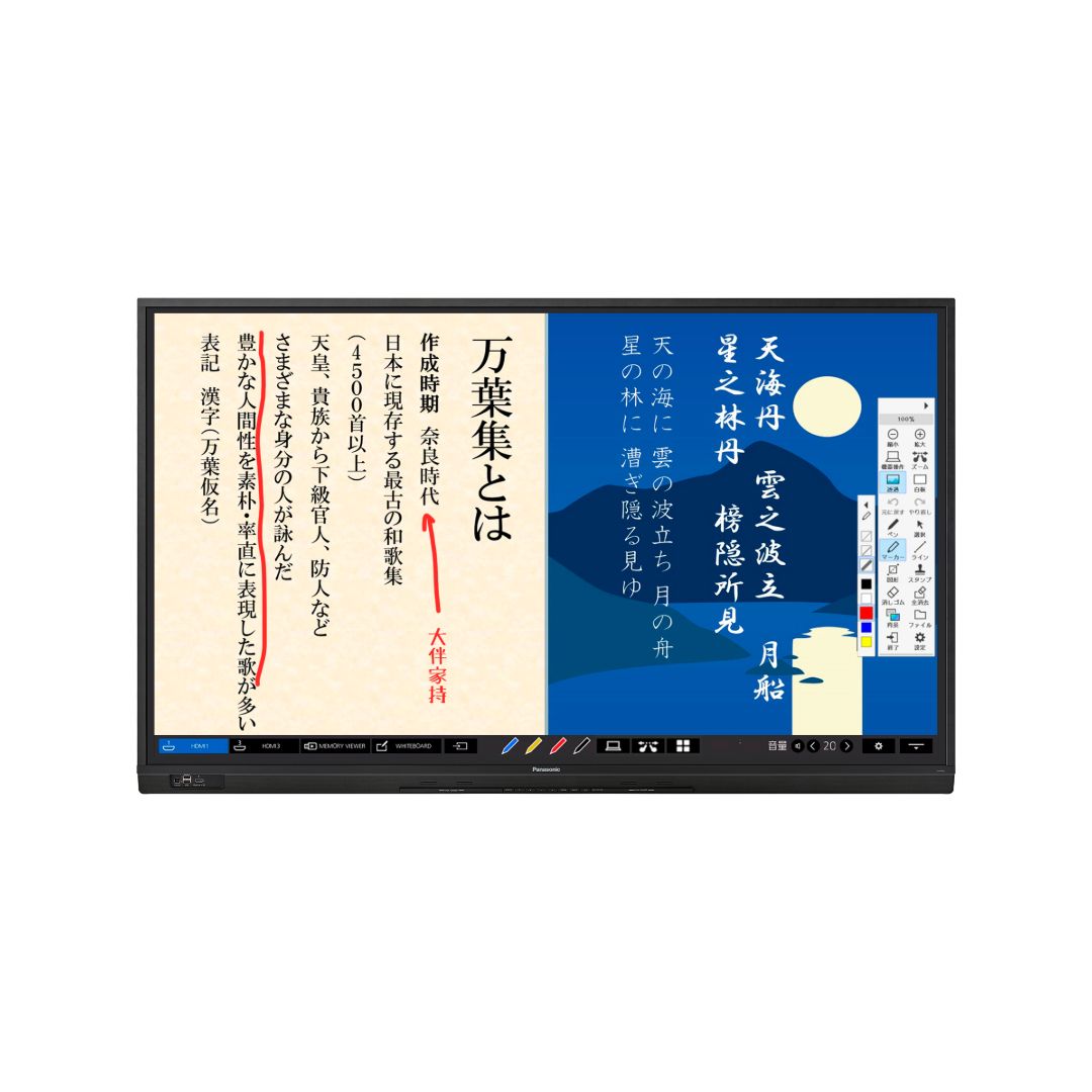 • 内蔵ホワイトボード機能: 電源をONにするだけですぐに書き込み開始。PCや実物投影機などの外部入力映像の上にも、キャプチャーの手間なく直接書き込みが可能です(透過モード)。