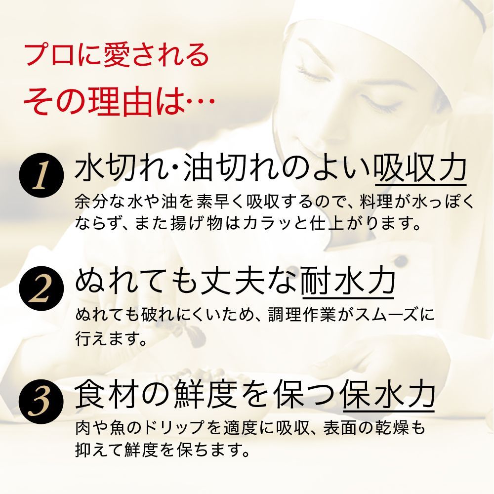 余分な水や油を素早く吸収するので、調理が素早く効率的に行え、料理の仕上がりも向上します。