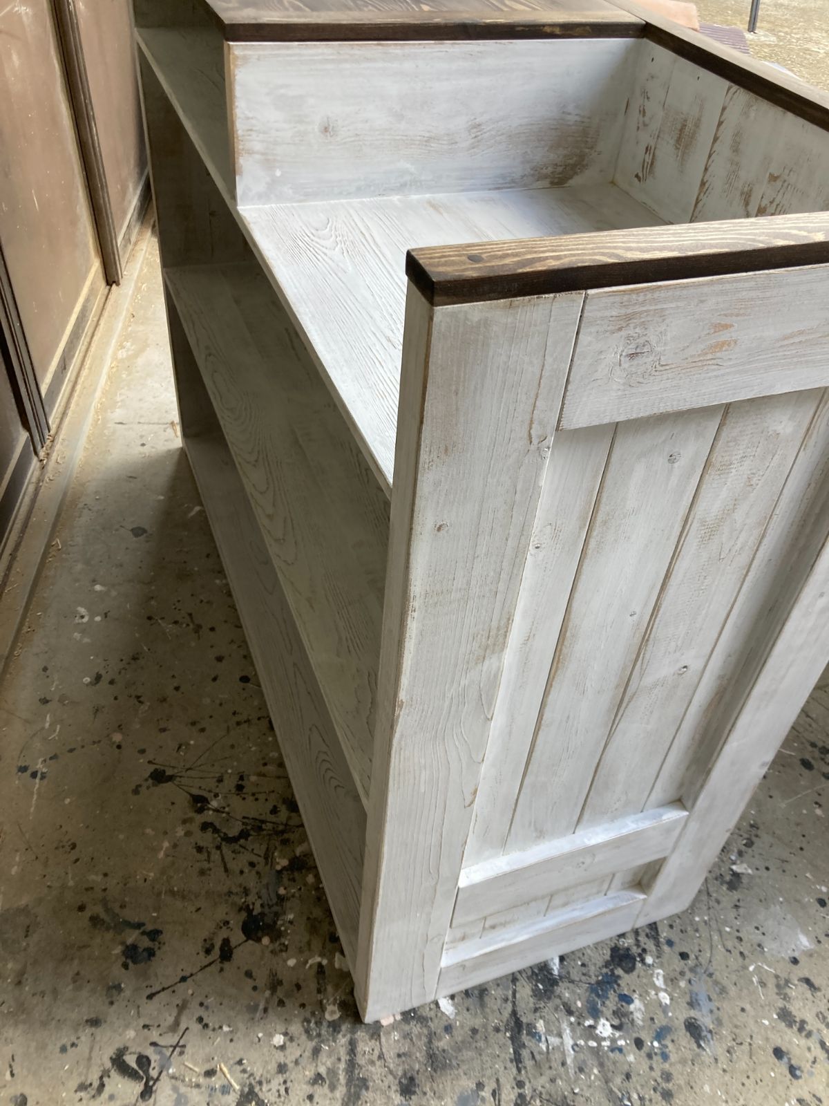 受注製作 ホワイトシャビー&エボニー レジ用凹み付 カウンターテーブル 1200 シェルフ付 店舗