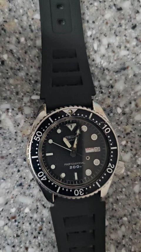 SEIKO プロフェッショナル 6458-6020 クォーツ時計です。オールブラック カラーで、重厚なデザインが特徴です。状態は写真の通り、ハンズの汚れが目立ちます。曜日表示、リュウズ操作はされていましたが、現在はできません。時間、日付は正常に作動します。日付も変わりますが、ベゼルが合いません。現在時計は作動中です。ベゼルも両方向に良く回ります。触って使う方、部品用で使う方、安く手に入れたい方、ご連絡ください。安くお譲りします。