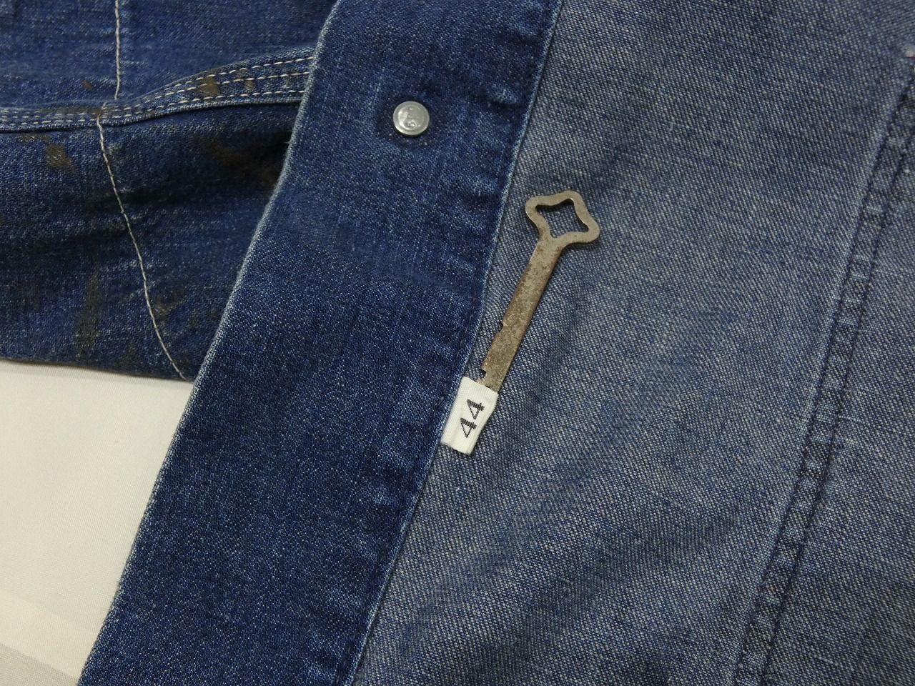 タグやボタン刻印等は無く詳細は不明ですが、デザインや凡庸ボタンなどからブルーベル系のブランドで間違いないかと思います。シンプルな4つポケのデザインでサイズも44インチと良いサイズ、しかも裏地無しですので、合わせやすくて飽きが来なく長くご愛用頂けそうです。この辺りの年代の物もアメリカでもめっきり見かけなくなってきました。今後はリーバイスなどと同様に価格の高騰が想定されます。お探しだった方は是非、ご検討下さい。