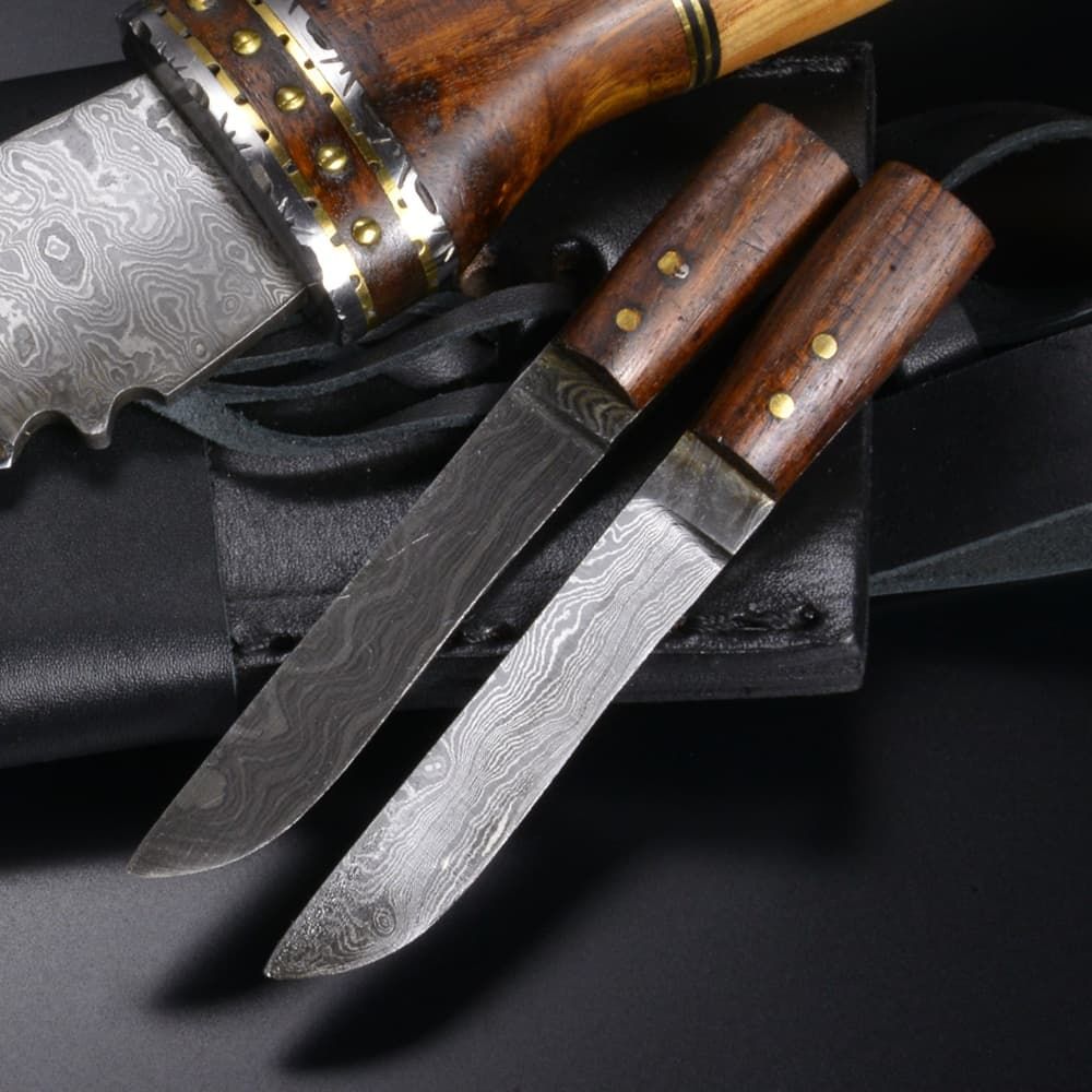 同じダマスカス鋼の小型ナイフが2本付属し、木の枝を削るなどの細かい作業も行うことができます。